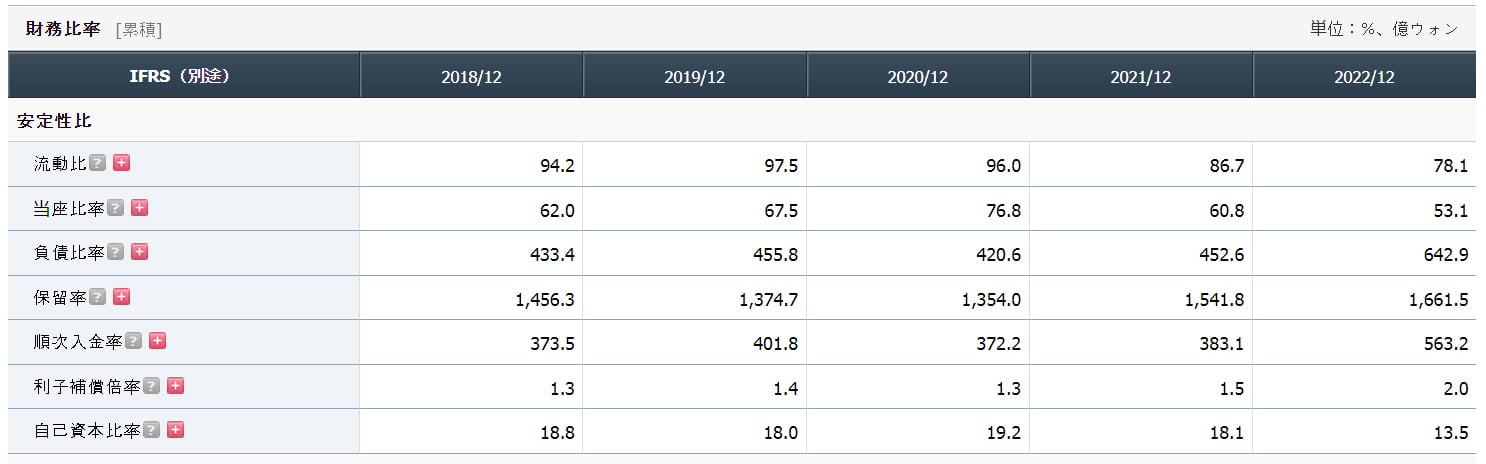 上掲のとおり、2022年12月末時点で『韓国ガス公社』の負債比率は「642.9%」もあります。つまり、負債が自己資本の6.429倍積み上がっているのです。