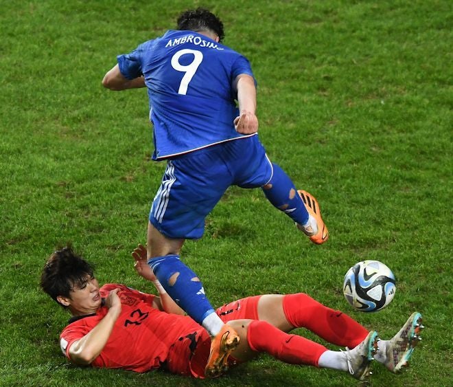 14分に先制を許した韓国は、23分にイ・スンウォンのPKで追いついたものの、86分にFKで勝ち越し点を奪われ、万事休した。
