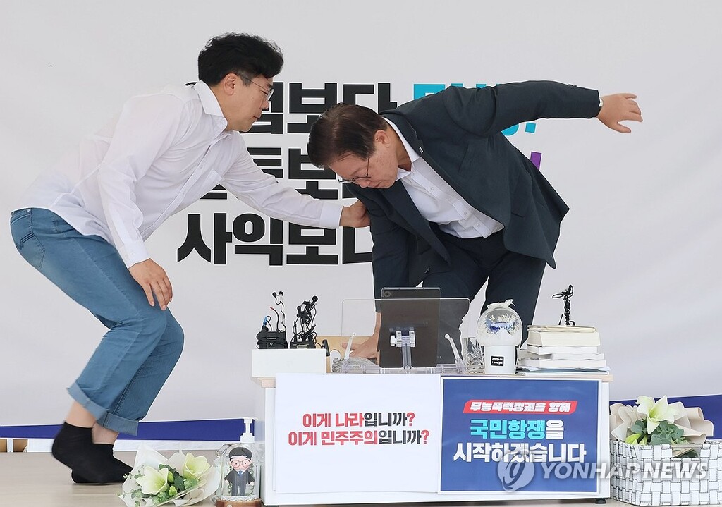 韓国最大野党「共に民主党」の李在明(イ・ジェミョン)代表(右)が、