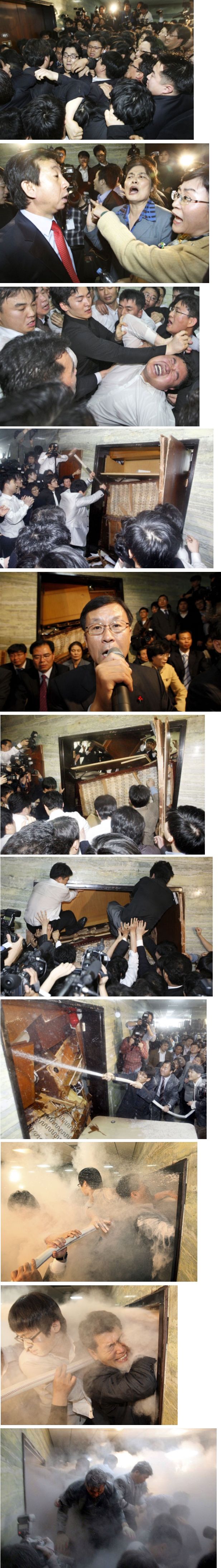 一方、民主労働党の金先東(キム・ソンドン)議員は、この日、ハンナラ党の批准案の強行処理を阻止するため、催涙弾を投げつけた。催涙弾が投げられると、本会議場の議長