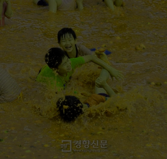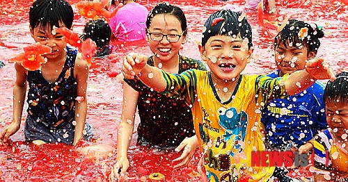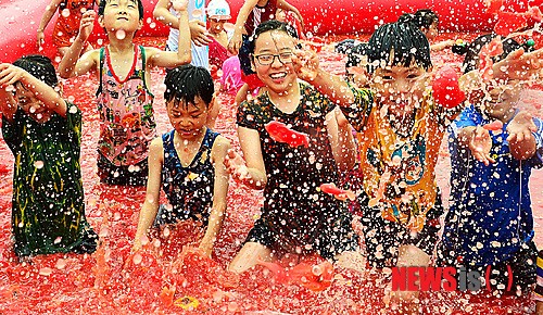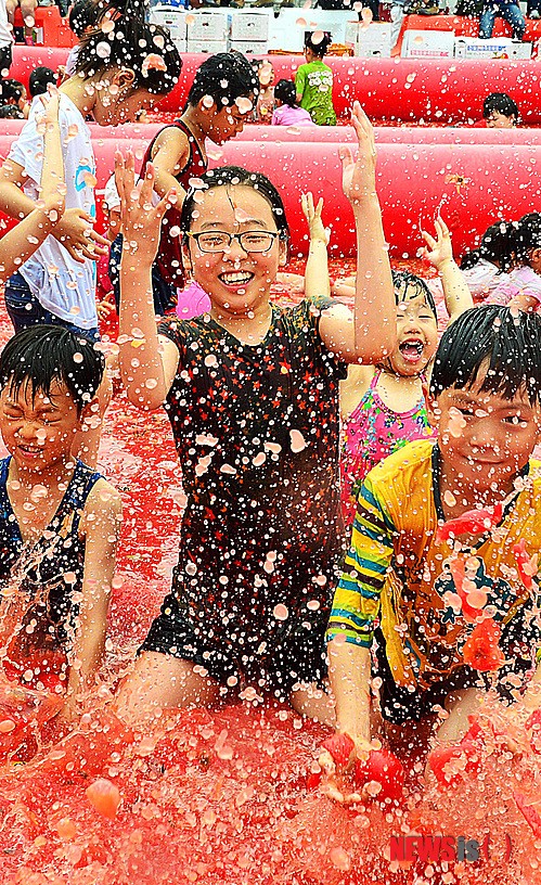 第11回退村トマト祭りで、子どもたちがトマトのプールで涼みながら楽しい時間を過ごして