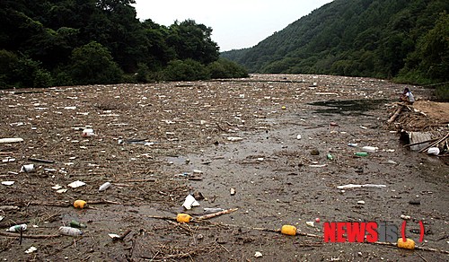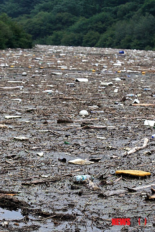 江原道揚口郡にある昭陽湖が、このところの集中豪雨によって渓谷から流れ込んだ