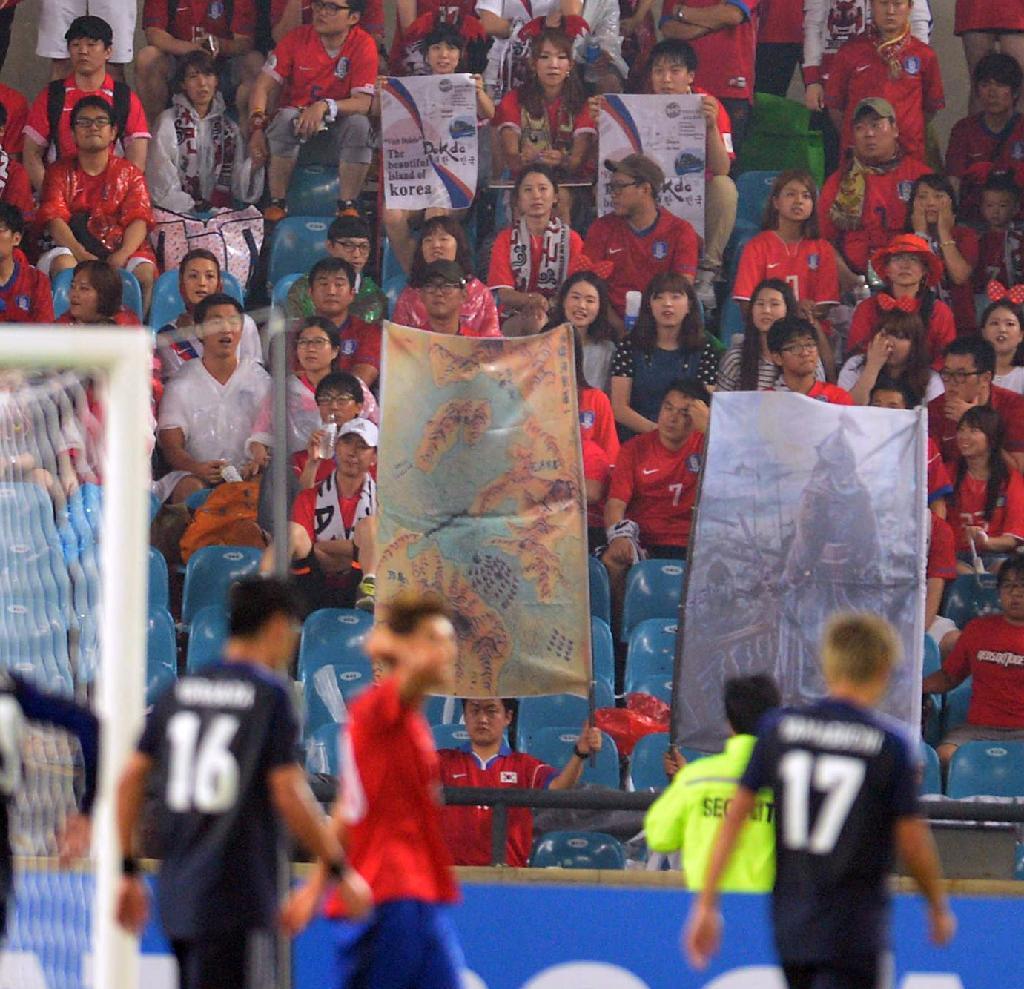 ▲ サッカー東アジア杯男子の日韓戦で、韓国応援団が掲げた横断幕。「歴史を忘れた民族に