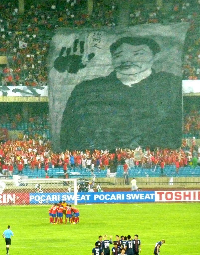 ▲ サッカー東アジア杯男子の日韓戦で、試合開始直前に韓国応援団が広げた安重根の肖像を