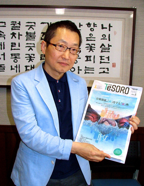 写真:「TeSORO」の5月号を持つ黄性淇編集長。表紙に「日韓関係、『政』冷でも『民』熱」と掲げ、多彩な交流の動きを取りあげた=大阪市北区の韓国文化院、中野晃撮影