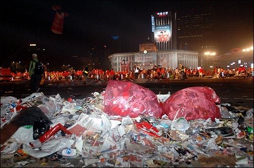 >ソウル江南区三成洞のCOEX前の永東大路で、応援団が試合後にゴミを集めている。