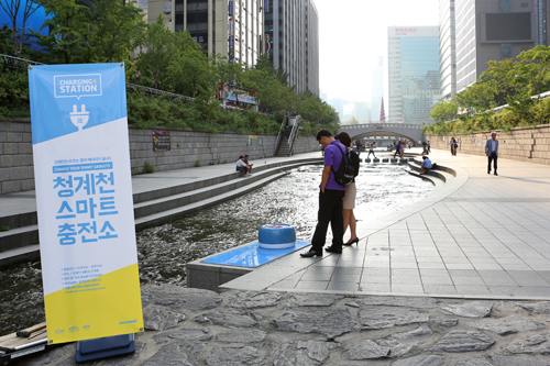 スマートデバイスの充電器を使用している。ソウル市が清渓川に設置した水力発電の充電器は、流れる水の力