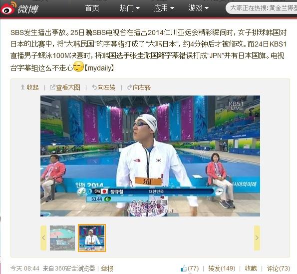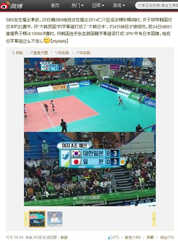 中で、女子バレーボール韓国-日本戦のスコア表示で「大韓民国」を誤って「大韓日本」と表記する