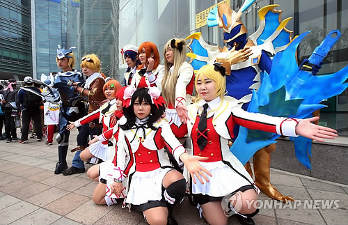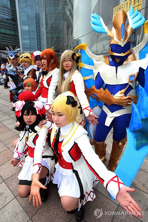 韓国農水産物流通公社aTセンターの前で、参加者がマンガキャラクターに扮装するコスチューム