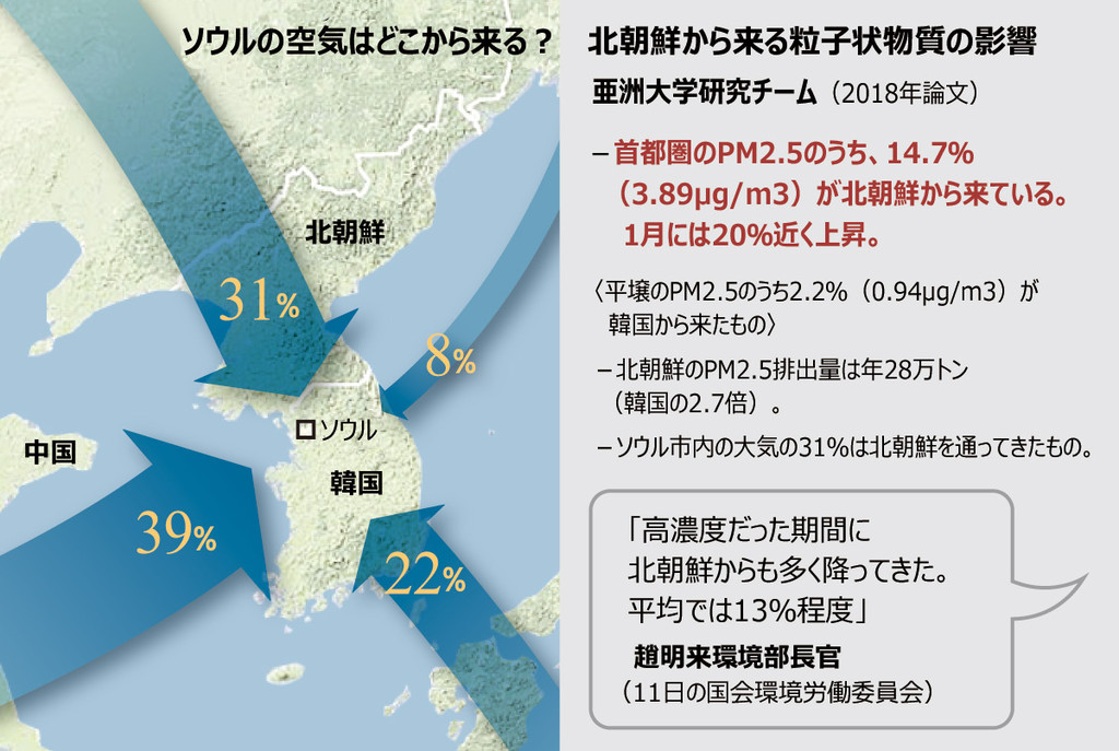 キム・スンテ教授ら亜洲大学研究チームは昨年、首都圏の微小粒子状物質(PM2.5)濃度で、北朝鮮の排出量の影響に関する論文を発表した。同研究チームはこの論文で、ソウル市内の空気の31%は北朝鮮から風に乗って流れ込んだものだと分析している。特に、粒子状物質が多い冬と春は北西の風が強いため、首都圏では北朝鮮の影響を受けざるを得ない構造だとのことだ。
