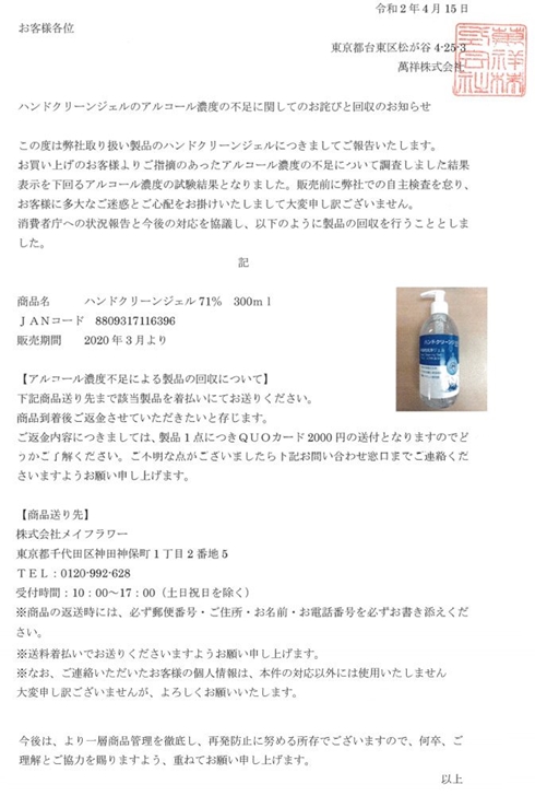 速乾性の手指用洗浄アルコールジェルとして販売されていた「ハンドクリーンジェル71%」が、アルコール濃度不足であったことが発覚し、同製品を取り扱っている萬祥と輸入元のメイフラワーが公式サイトで謝罪しています。