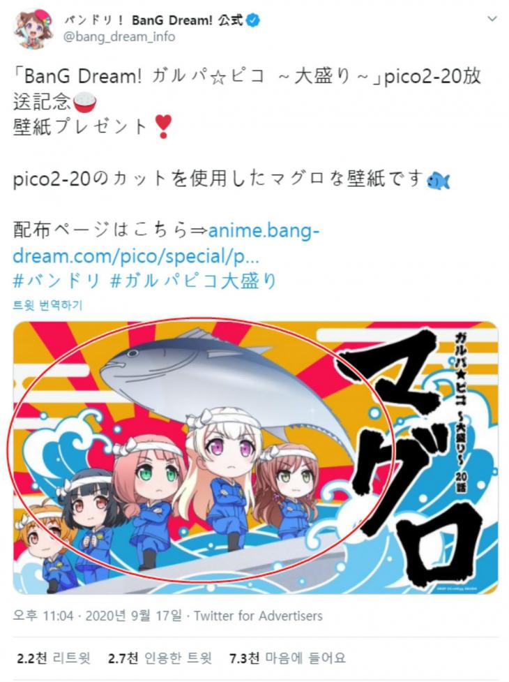 「バンドリ!」公式ツイッターは去る17日夜、アニメ「ガルパ☆ピコ」の一場面をイラストにして公開した。公開されたイメージにはキャラクターの後にマグロが飛びはねる姿と共に太陽が昇る場面が入れられた。