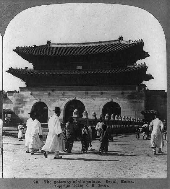 1903年。朝鮮半島が日本の保護国になる2年前に撮影されたもので李王朝宮殿への両班の出仕風景。
