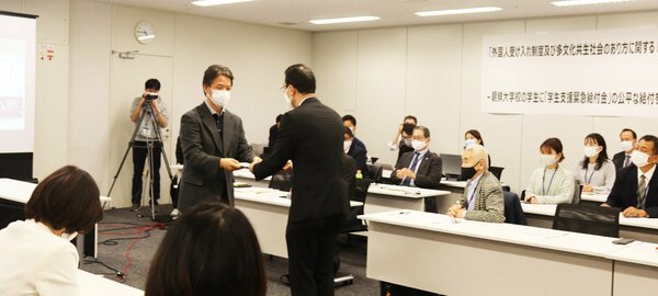 新型コロナウイルスの影響で困窮する学生向けに政府が5月に創設した「学生支援緊急給付金」の対象に朝鮮大学校(東京都)が含まれていないことを受け、公平な支給を求める大学教職員の声明を取りまとめた同志社大の板垣竜太教授が30日、国会内で文科省担当者に要請書を手渡した。