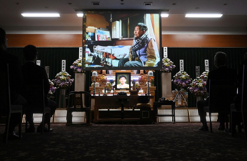 告別式でスクリーンに映し出された「ハンメ」の晩年の写真=京都府宇治市で2020年11月24日、山田尚弘撮影