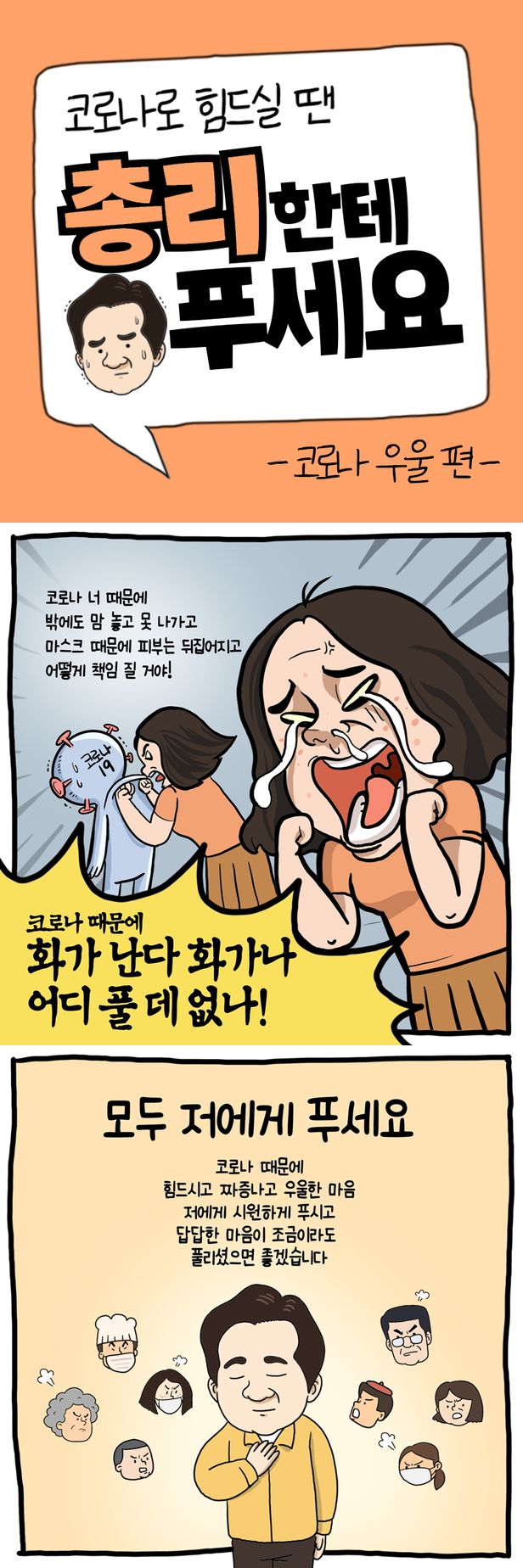 14日午前、大韓民国国務調整室・国務総理秘書公式アカウントはTwitterに、「コロナで苦しい時は首相で解消して - コロナ憂鬱編 - 」というタイトルの3コマ漫画を掲載した。