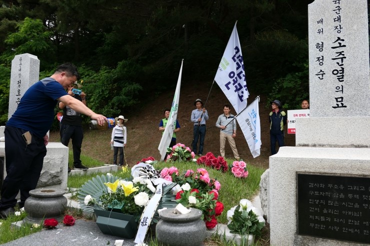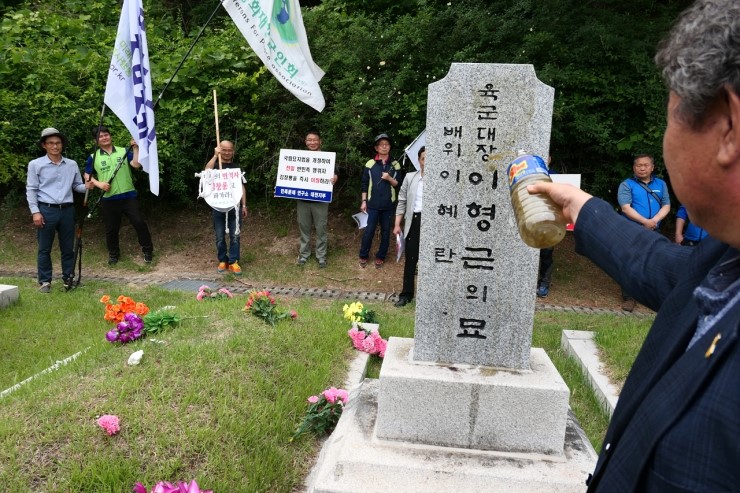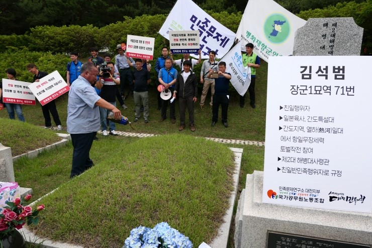 ある参加者はペク将軍の墓碑前で「独立活動家を討伐した満州士官学校出身」と言った。参加者はペク将軍を「反民族行為者」と呼び「移葬せよ」「国立墓地法を改正せよ」等スローガンを叫んで腕を振りあげた。