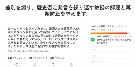 同団体は、「差別を煽り、歴史否定発言を繰り返す教授の解雇と再発防止を求めます」という請願文で有馬教授が先月26日、欧州や米国で韓国人や韓国系の人が日本人がやっているように見せかけて日本ブランドの寿司やラーメンを売っているとするツイートを投稿するなど、繰り返し差別を煽っていると指摘した。